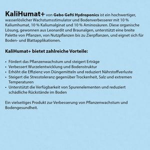 KaliHumat+ von Gebo Gefti hydroponics besteht aus einer Suspension mit 10 Prozent Kaliumhumat (extrahiert aus Leonardit), 10 Prozent Kaliumalginat (gewonnen aus Braunalgen) und 10 Prozent Aminosäuren. Diese Lösung stellt einen hochwertigen, wasserlöslichen Stimulator für das Pflanzenwachstum und einenBodenverbesserer dar. Sie findet Anwendung in der Landwirtschaft, beiZierpflanzen, Obstbäumen, Blumen und Rasenflächen, sowohl für den Boden als auch als Blattspray. Die organische Verbindung in KaliHumat+ wird nur langsam von Bodenmikroorganismen abgebaut. Es kann alleine verwendet oder mit den meisten Düngemitteln gemischt werden.